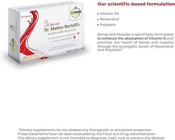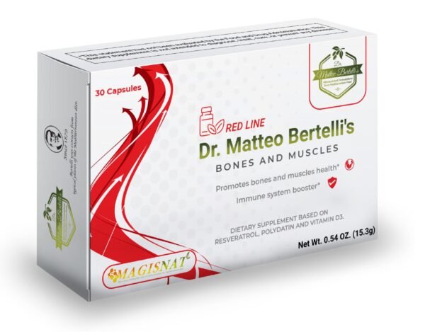 Elevate your wellness with Dr. Matteo Bertelli’s Bones & Muscles, a premium dietary supplement expertly formulated to boost bone strength, muscle function, and cardiovascular health. Harnessing the synergistic power of Vitamin D3, Resveratrol, and Polydatin, this advanced formula promotes superior nutrient absorption and holistic body support.*