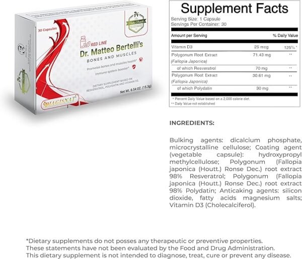 Dr. Matteo Bertelli’s Bones & Muscles is a Dietary Supplement formulated with Resveratrol, Polydatin, and Vitamin D3.