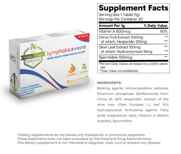 Dr. Matteo Bertelli’s Lymphatic & Veins is a Dietary Supplement with Hydroxytyrosol from olive tree, Hesperidin, Vitamin A and Spermidine.